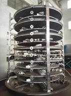 空心加热盘是该干燥器的主要部件,其内部通以饱和蒸汽、热水或导热油,作为加热介质。故加热盘实际是一个压力容器。因此在其内部以一定排列方式焊有折流隔板或短管,一方面增加了加热介质在空心盘内的扰动,提高了传热效果;另一方面增加了空心盘的刚度并提高了其承载能力。每个加热盘上均有热载体的进出口接管。各层加热盘间保持一定间距,水平固定在框架上。